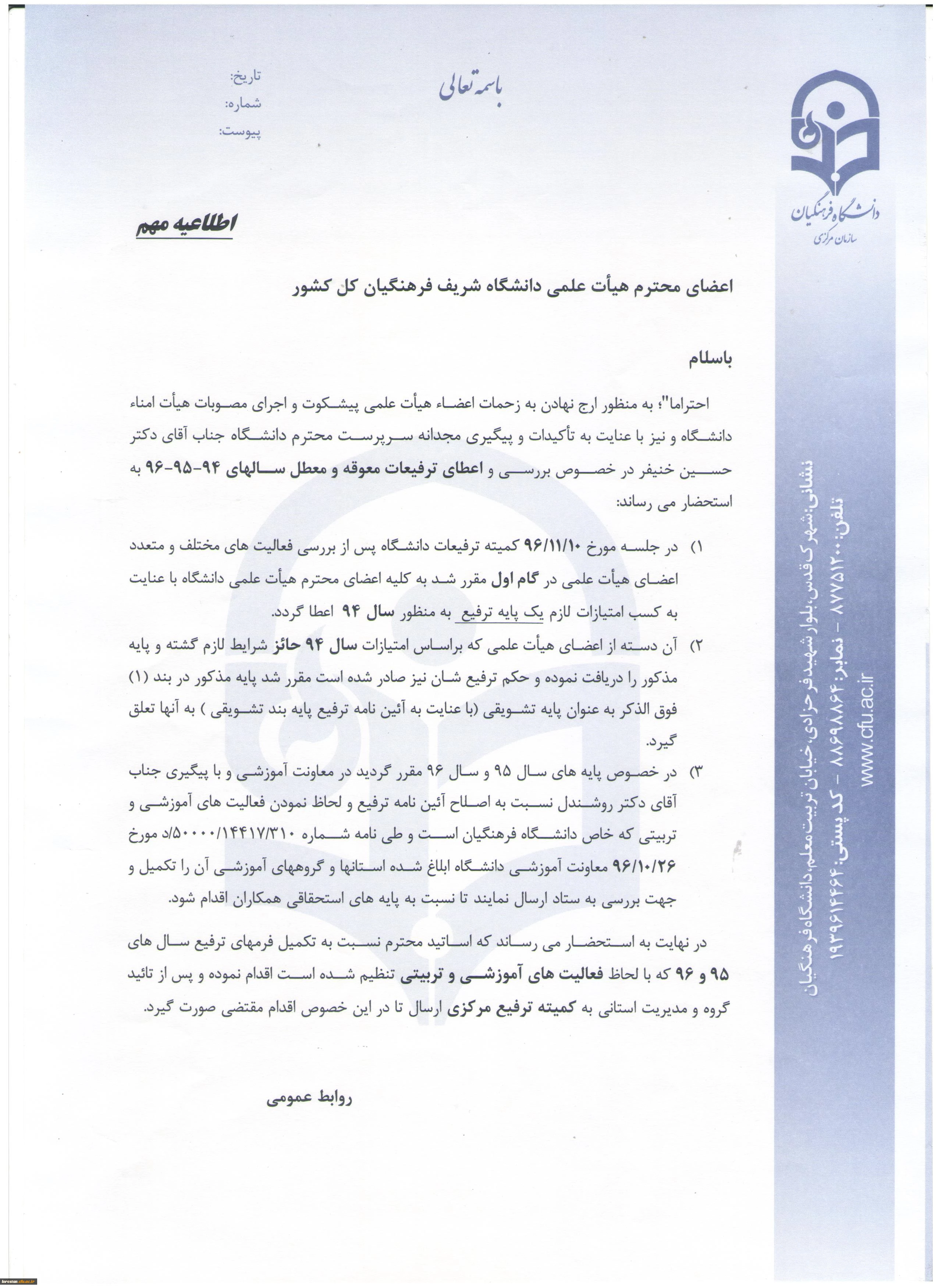 امتیاز دهید : تصمیماتی در خصوص بررسی و اعطای ترفیعات معوقه و معطل سال های 94-95-96 چهارشنبه 18 بهمن 1396 ساعت 10:02