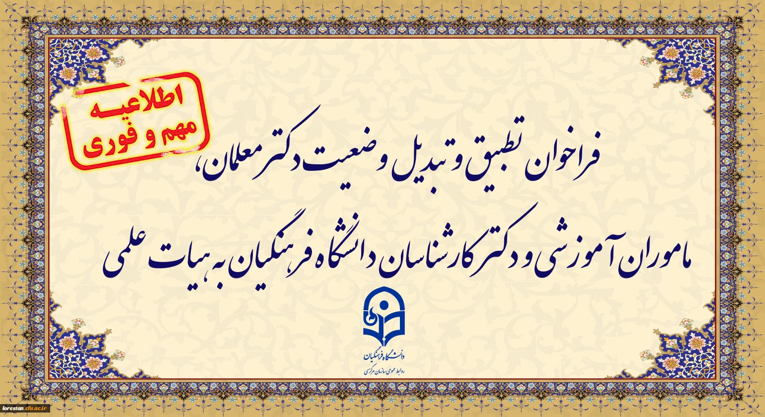 فراخوان دستورالعمل تطبیق و تبدیل وضعیت دکترمعلمان، ماموران آموزشی و دکترکارشناسان دانشگاه فرهنگیان به هیات علمی 2